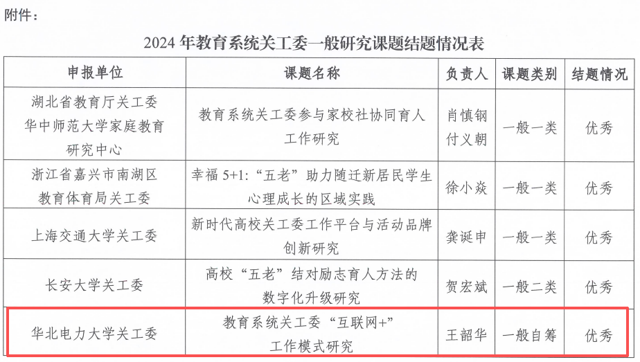 近日,教育部关工委公布2024年教育系统关工委一般研究课题结题评审结果,我校关工委推荐、控制与计算机工程学院关工委负责的《教育系统关工委"互联网+"工作模式研究》课题,顺利通过结题验收并获评"优秀"等级。本次全国仅5项课题获评优秀,我校课题成功入选,实现了我校关工委在教育部关工委课题研究领域的新突破。